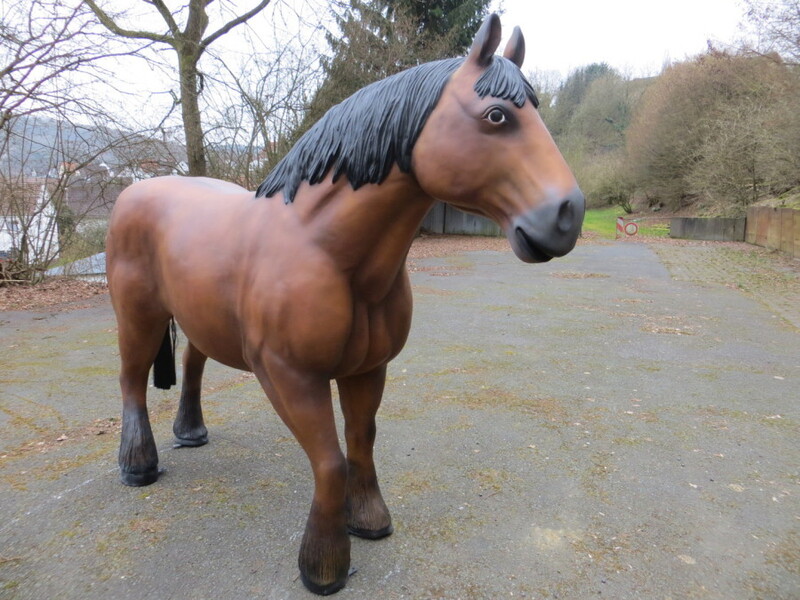 Pferdefiguren lebensgross, grosses Deko Pferd lebensgross - brauner Belgier als Gartenfigur oder Innendeko, mit Kunsthaarschweif